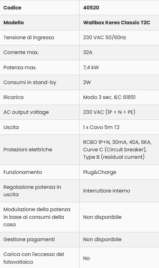 La wallbox della serie Keres è la new entry della famiglia di sistemi di ricarica Detas EVchargers. È caratterizzata da una compatta custodia in materiale termoplastico IP65 IK09 ed è disponibile con cavo da 5m e connettore Tipo2 in versione monofase o trifase. Il sistema di controllo permette il comando e la regolazione remota della ricarica. La versione standard permette la regolazione della potenza di ricarica tramite interruttore interno mentre gli altri modelli si collegano alla app tramite bluetooth per permettere il comando e la regolazione remota della ricarica. È disponibile anche una versione per poter ricaricare con eccesso di produzione fotovoltaica. Nella wallbox Keres è compreso l’interruttore magnetermico differenziale da 40A di tipo B.